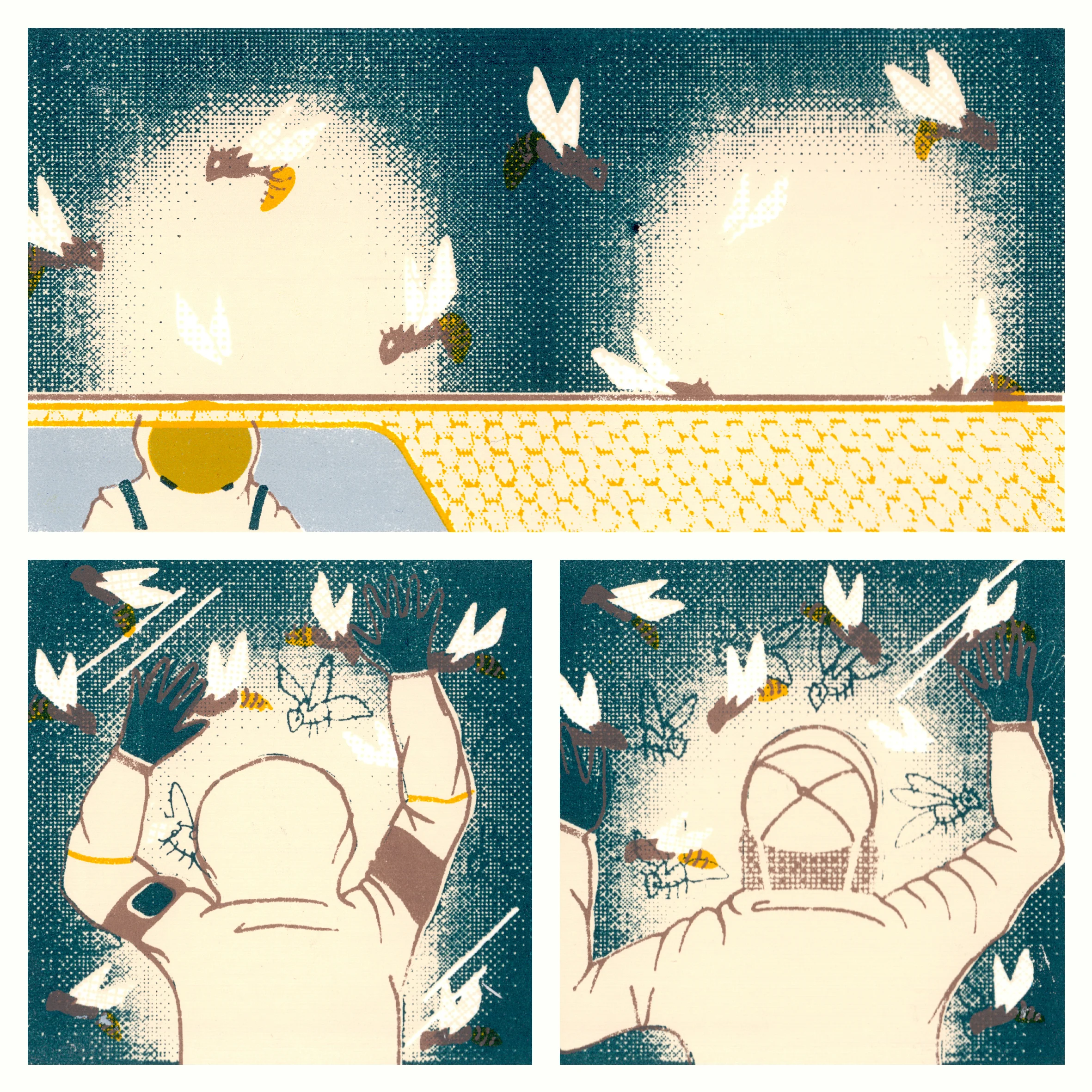 Apis- A bee keeper applies to be part of a space exploration mission, which due to unforeseen circumstances results in him floating alone in space contemplating solitude and the nature of exploration. Apis is a 28 page hand screen printed book which I produced as part of my final major project at the Arts University Bournemouth.